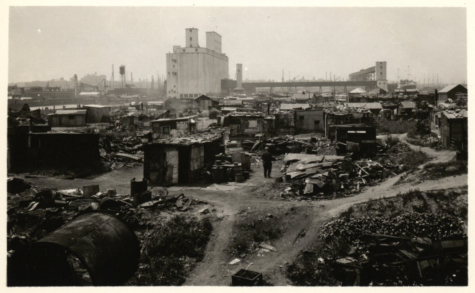 A “Hooverville” shanty town at the foot of the Grain Terminal in 1930. NYC Municipal Archives Collection